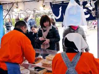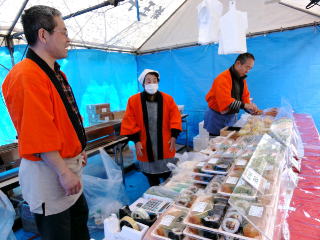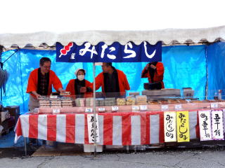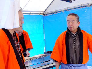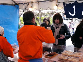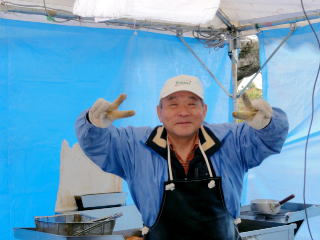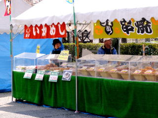 ピンクに変色してきている。こちらは、今年初めて出店した『上原商店』さんのテント風景。販売したのは、「いかめし」「子持ちイカ」「たこたまご」など。 昨年は3・11が原因となり、